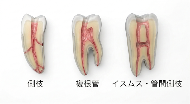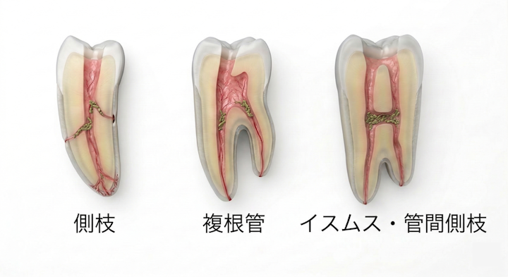 根管は一本の単純な管ではなく、実際には枝分かれや連結を伴う立体構造です。側枝は主根管から分岐する細い通路、イスムスは2本以上の根管をつなぐ帯状の細い空間であり、特に大臼歯(奥歯)で極めて高い頻度で認められます。これらは細菌にとって格好の隠れ家となります。