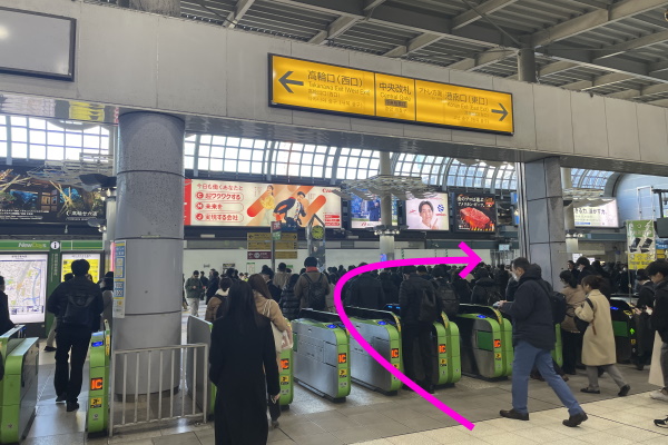 品川駅で下車し、改札を出ます。改札を出たら右方向(港南口/東口方向)に進みます。