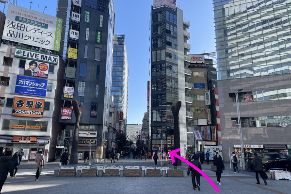 駅前の主要動線に沿って港南エリア側へ進みます。正面に当院のあるビルが見えます。